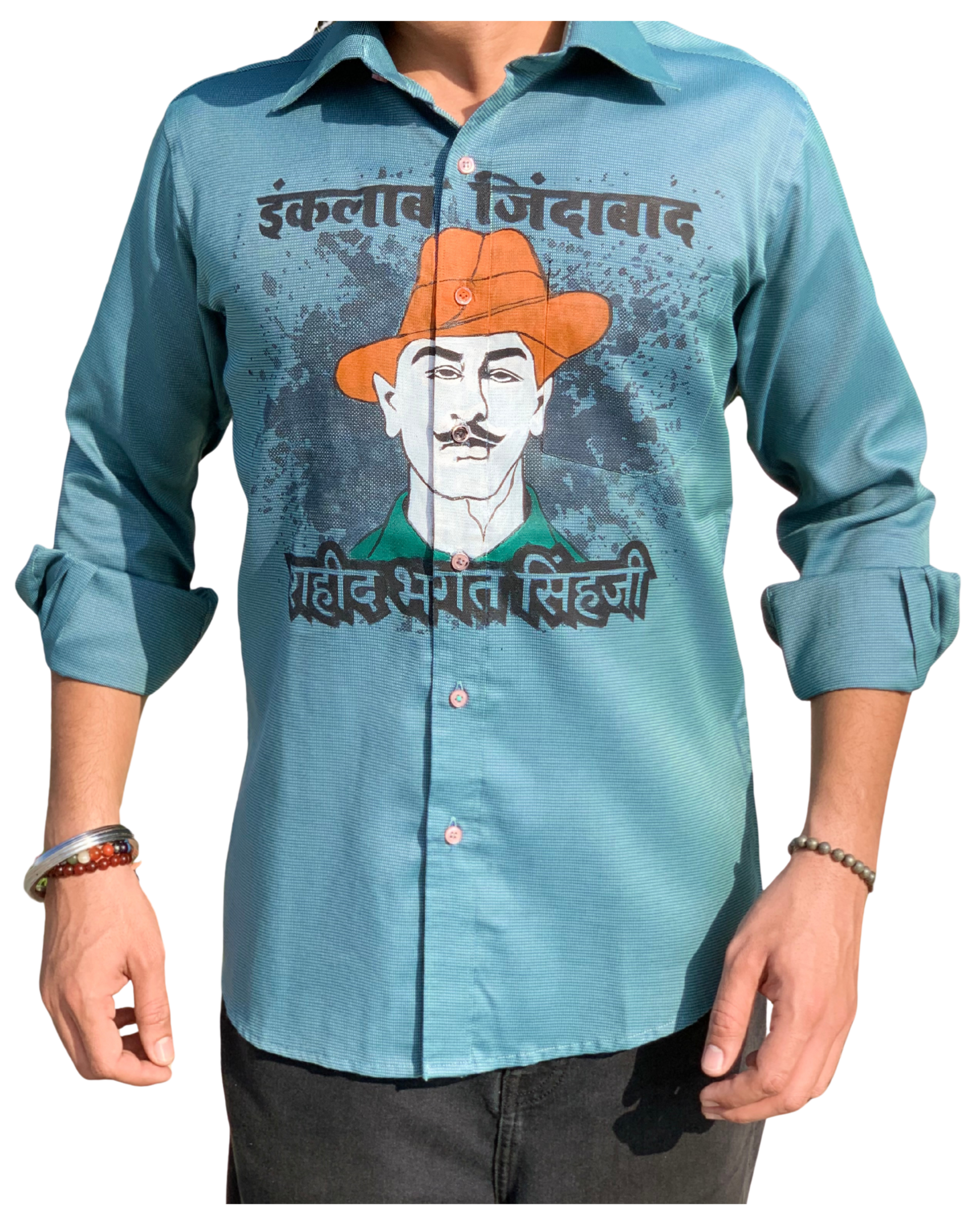 Show your patriotic spirit with pride! The Sky Blue Bhagat Singh “Inquilab Zindabad” Shirt by JAI HIND BRO is designed for every Indian who carries the fire of revolution and freedom within. Featuring a bold artistic print of Shaheed Bhagat Singh and his iconic slogan, this shirt perfectly blends modern fashion with deshbhakti.