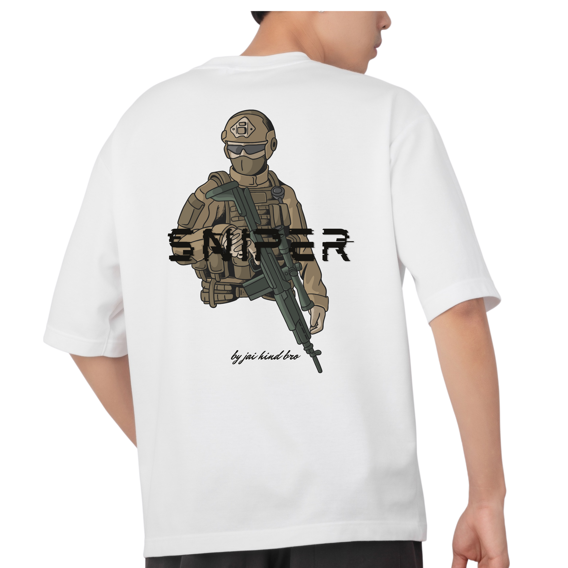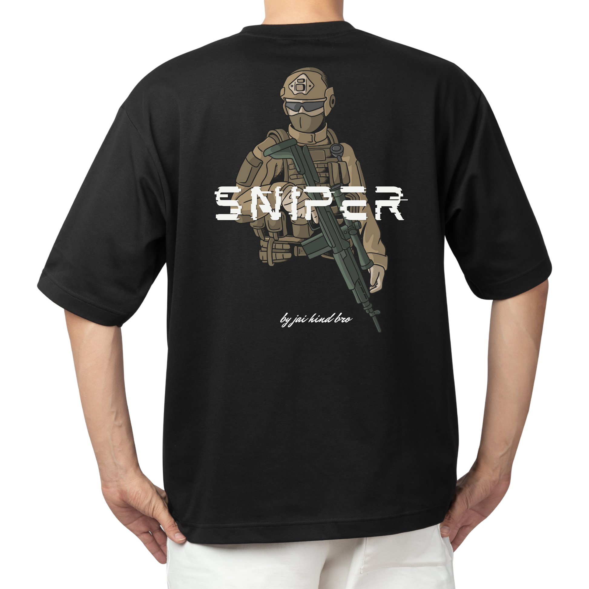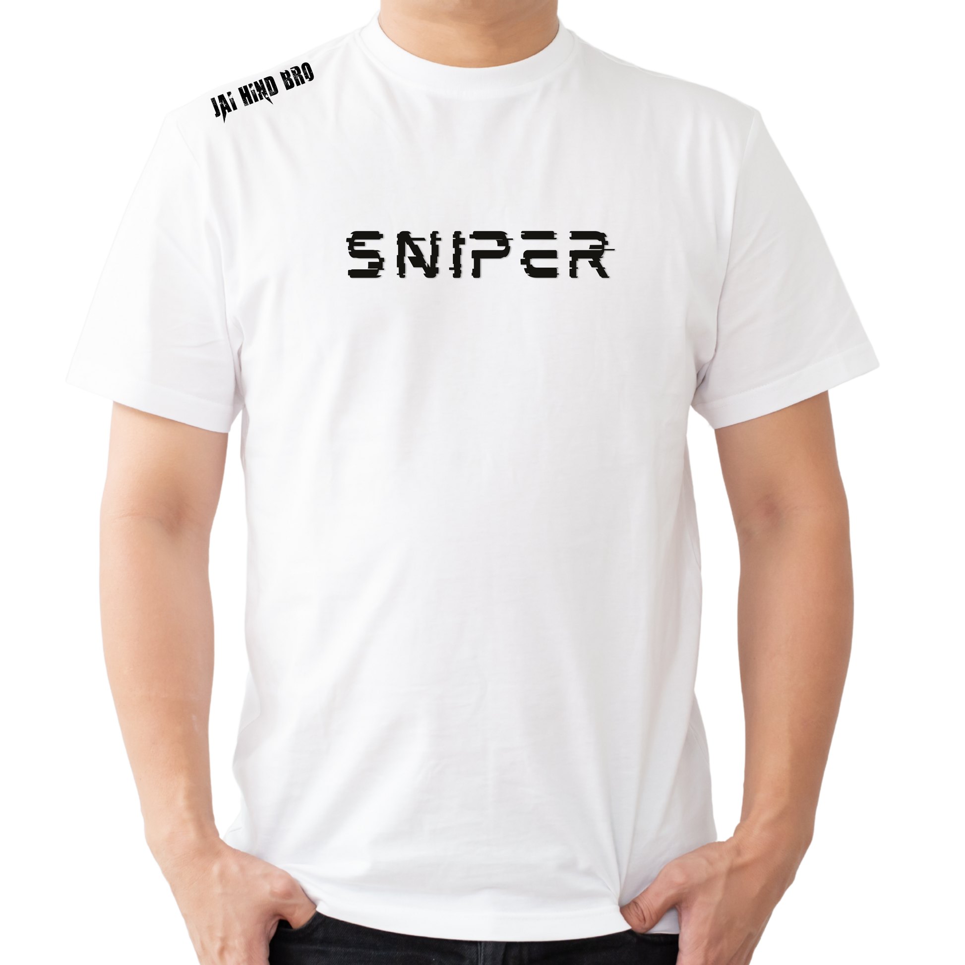 Step into bold streetwear style with the SNIPER Graphic T-Shirt by JAI HIND BRO. Designed for those who embody strength, precision, and attitude, this tee features a striking illustration of a fully geared soldier with a sniper rifle. The glitch-effect "SNIPER" typography adds a modern, edgy vibe, while the “by jai hind bro” signature detail completes the unique design.